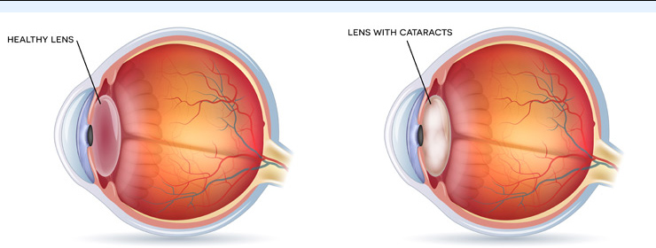 A cataract is the clouding of the crystalline lens in your eye. This opacity obstructs the passage of light resulting in a reduction of clear vision. Normally, light passes through the clear lens and is focused onto the Retina. However, the natural aging process can cause the lens to become cloudy, or milky. The cataract blocks the passage of light through the eye and causes distorted or blurred vision, glare, or difficulty seeing in poor lighting conditions.